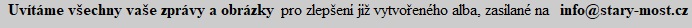 Vážení přátelé a milovníci starého Mostu, nabízíme projekt fotografické prohlídky tohoto zmizelého města. Dovolili jsme si shromáždit volně dostupné fotografie zejména z Facebooku, další pak ze stránky mapy.mesto-most.cz a něco málo z různých deníků. Uspořádali jsme je tak, aby vám jejich prohlížení připomínalo procházku danou částí města. V době 3D zobrazování již nic působivého, ale dá se to vytvořit celkem jednoduše a rychle. A ve větším celku vám všem tak připomenout to, co jsme v mládí znali, kde jsme chodili a co je již nenávratně pryč. Jsme si vědomi určitého porušení autorského zákona u některých fotografií, proto bychom uvítali shovívavost jejich autorů. Současně jsme si vědomi, že používáme dokumenty s určitými chybami, které však pro nedostatečnou znalost tehdejšího Mostu a také němčiny nedokážeme opravit.